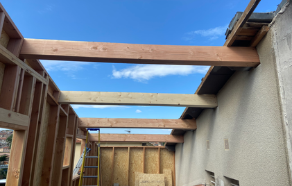 Démolition du toit du garage pour créer un solivage qui viendra soutenir les murs ossature bois de la sur-élévation